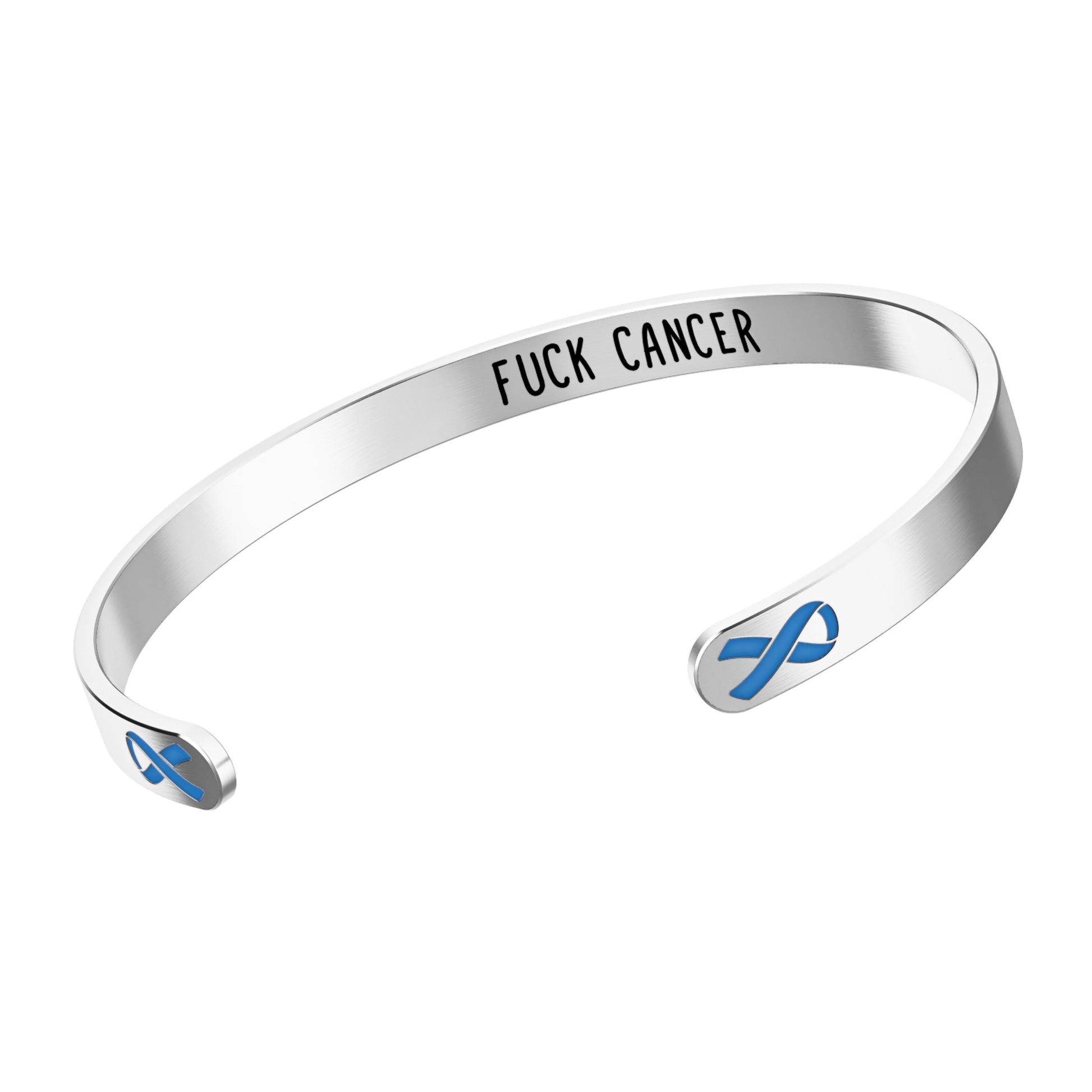 High-quality stainless-steel cuff bracelet designed for the great women who are fighting or have fought against colon cancer and for the friends and family that have stood by their side in the fight. They come in a nice velvet gift bag, has the cancer ribbon on the outside and a hidden message “F@@k Cancer” on the inside. Beautiful classic bracelet that will match any outfit or occasion. Show your appreciation for the strength of people and their family & friends that have fought cancer.