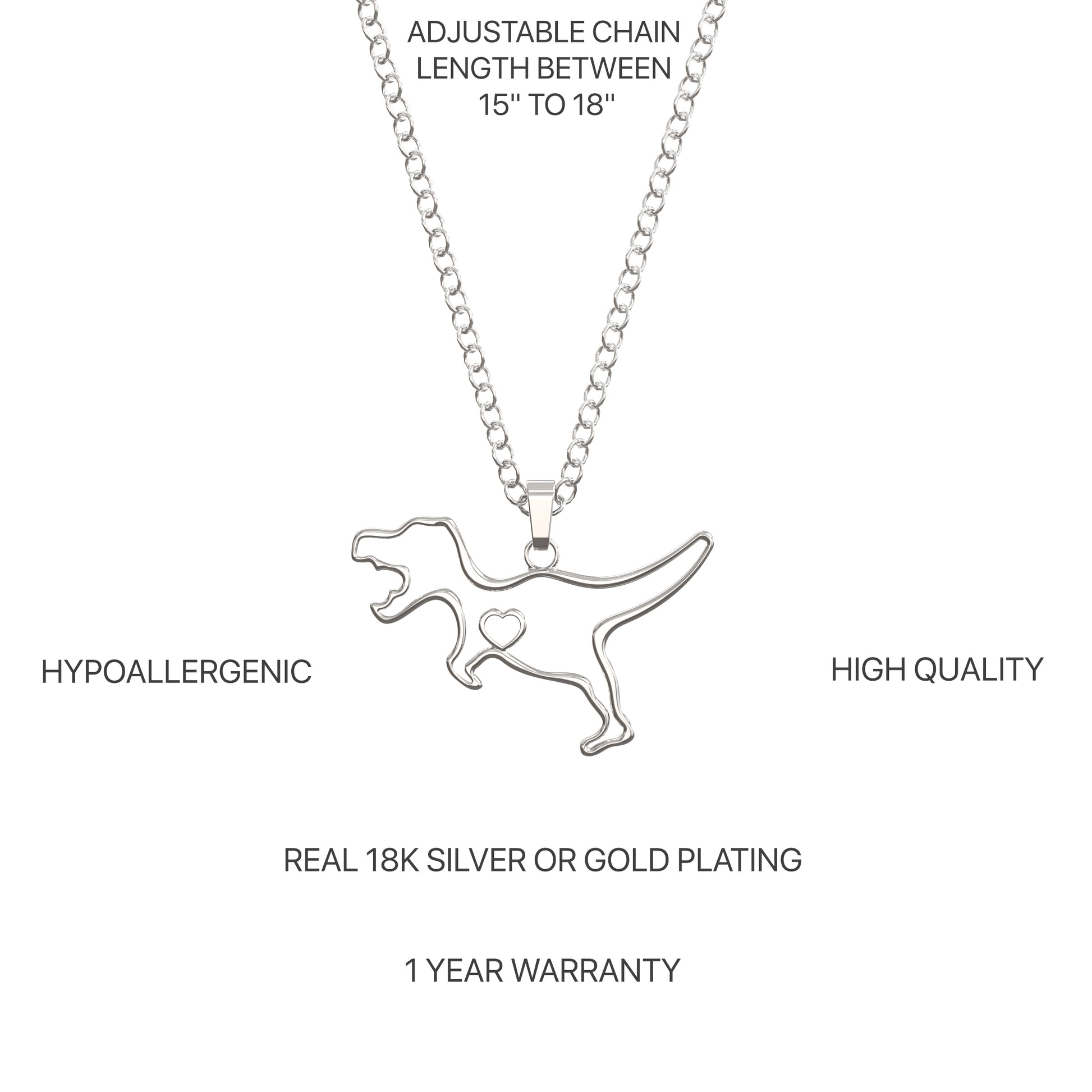 Indulge your passion for dinosaurs with our stunning 18K silver-plated T-Rex necklace, adorned with a heart detail for extra charm. This adorable pendant is the perfect gift for dinosaur enthusiasts of all ages, boasting quality construction and lasting durability. Packaged with a heartfelt message card, it's a meaningful token of your affection. With its ideal dimensions and timeless design, this necklace is sure to become a cherished accessory for any dinosaur lover. Get yours today and add a touch of prehistoric elegance to your jewelry collection!